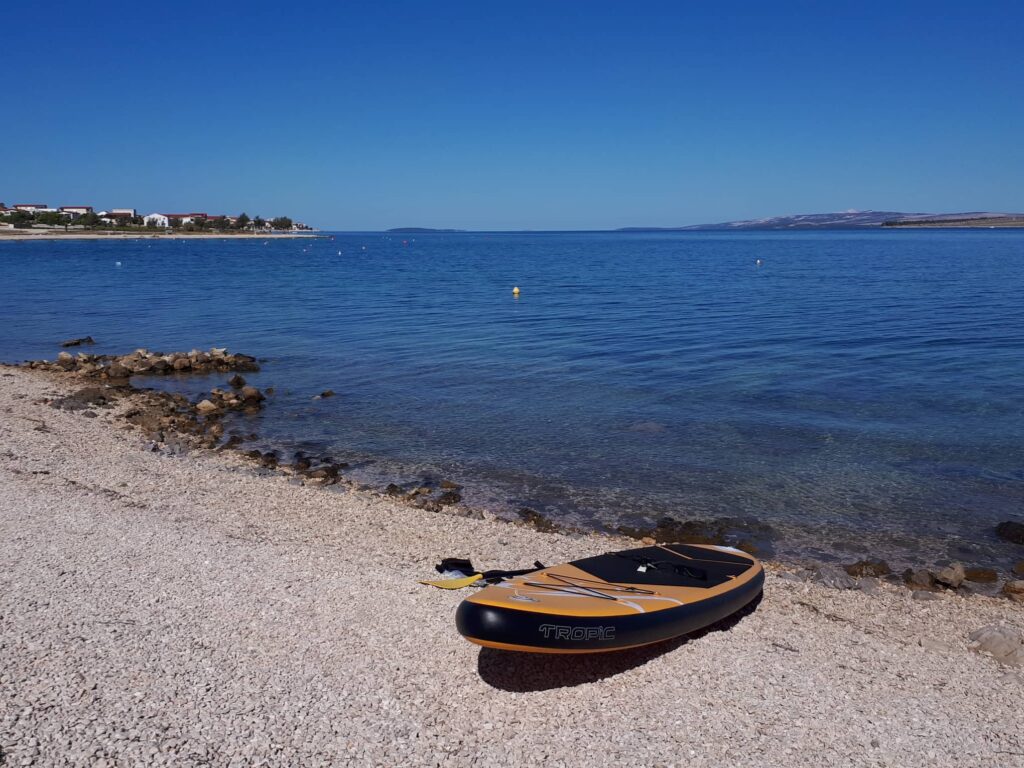 Der Strand am Ende der Straße ist kiesig und es vertieft sich langsam, so es ist ideal nicht nur für Familien mit Kindern, aber auch für Liebhaber von SUP und Bootfahren.